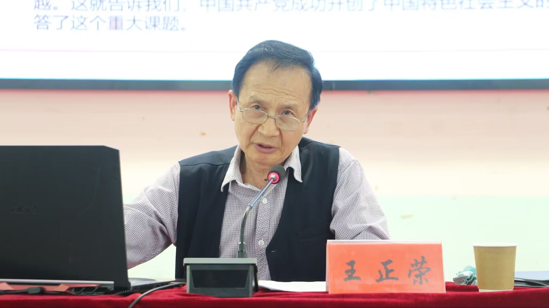 王正荣老师以“中国共产党百年奋斗史”为题,回顾了我们党在新民主主义革命时期、社会主义革命和建设时期、改革开放和社会主义现代化建设新时期和中国特色社会主义新时代四个历史时期的光辉历程,穿插讲述了孙中山、毛泽东、周恩来、彭德怀、习仲勋等老一辈革命家的小故事,分享了自身在部队以及学校40余年的奋斗经历,用通俗易懂的语言讲述党史、感怀党恩。报告会现场气氛热烈,同学们听得深情专注,大家都被老一辈革命家、建设者们不怕牺牲、艰苦奋斗的精神所影响、所感动。