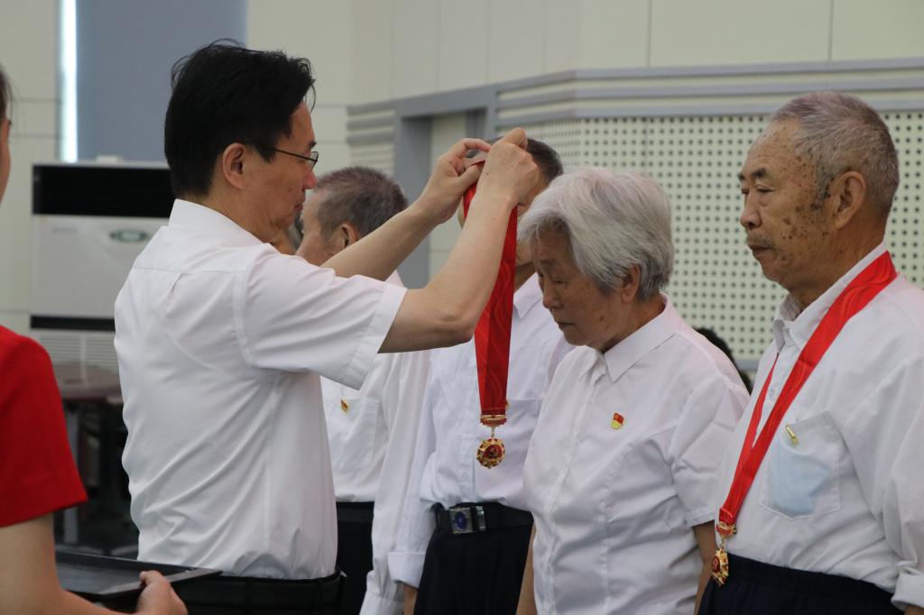 曾获“全国优秀教师”称号、化学与材料科学学院退休教师乐立新教授代表获颁纪念章的老党员作了情真意切的发言。