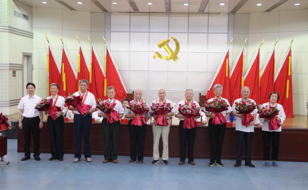 随后,彭瑜为老党员代表颁发“光荣在党50年”纪念章,青年学生代表向他们献花致敬。
