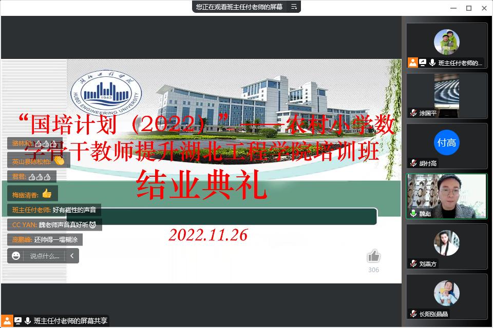 11月26日上午,由我院承办的“国培计划(2022)”——农村小学数学骨干教师提升培训(A026 小学数学)威廉williamhill培训班顺利结业。威廉williamhill继续教育学院院长涂国平、WilliamHill威廉希尔院长肖应雄教授、项目负责人胡付高教授,以及来自宜昌市、黄冈市、襄阳市、咸宁市、孝感市的100位参训学员通过腾讯会议参加了结业典礼。