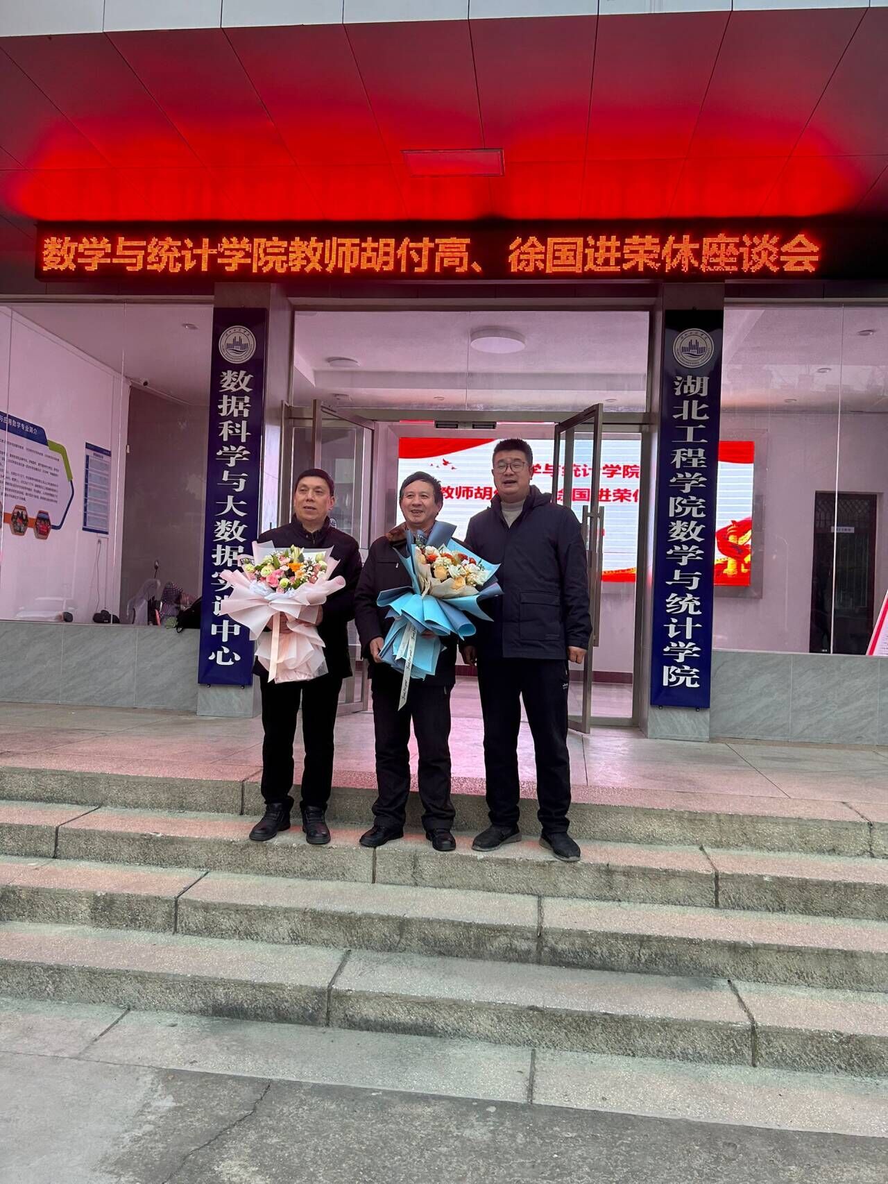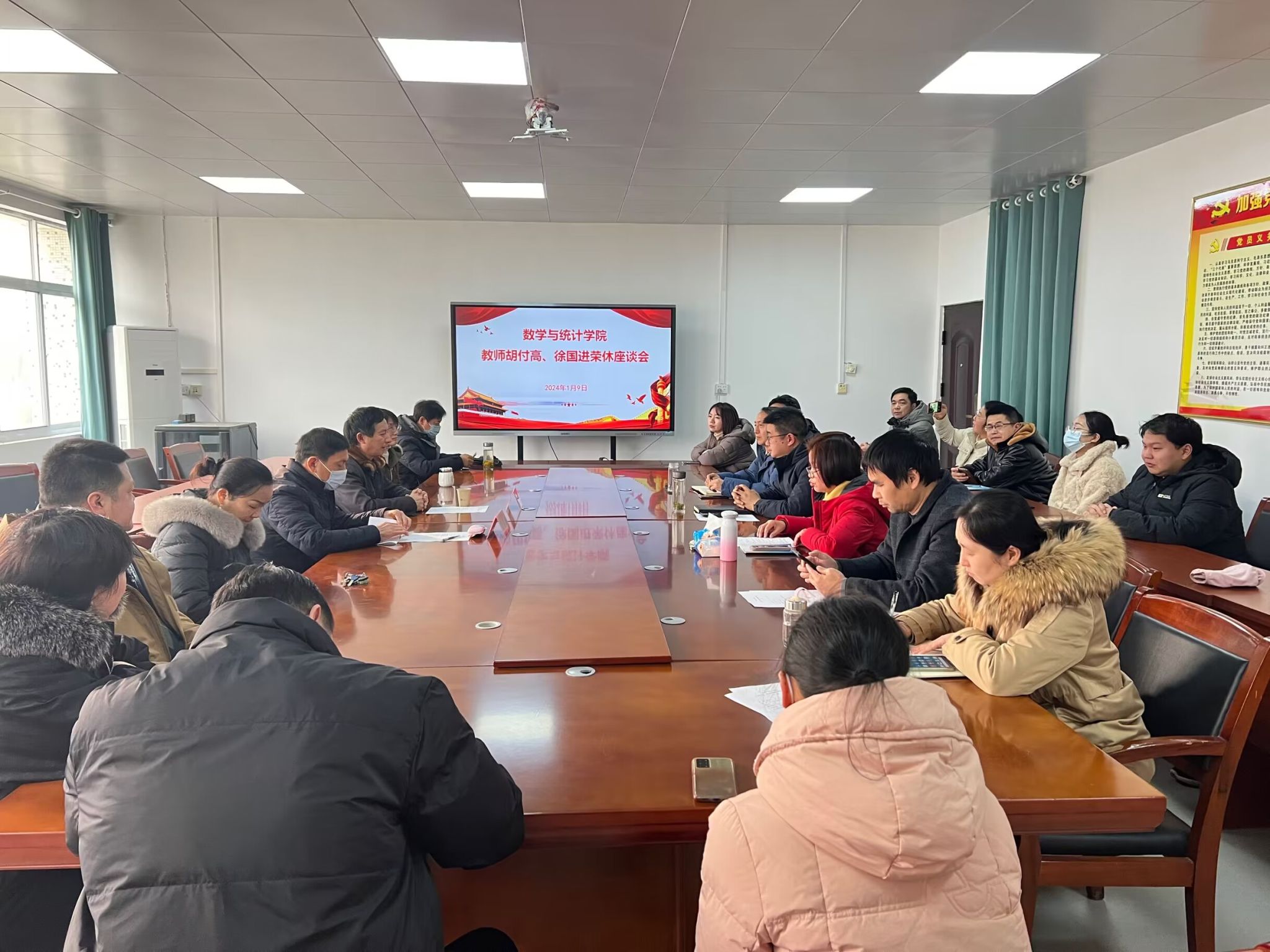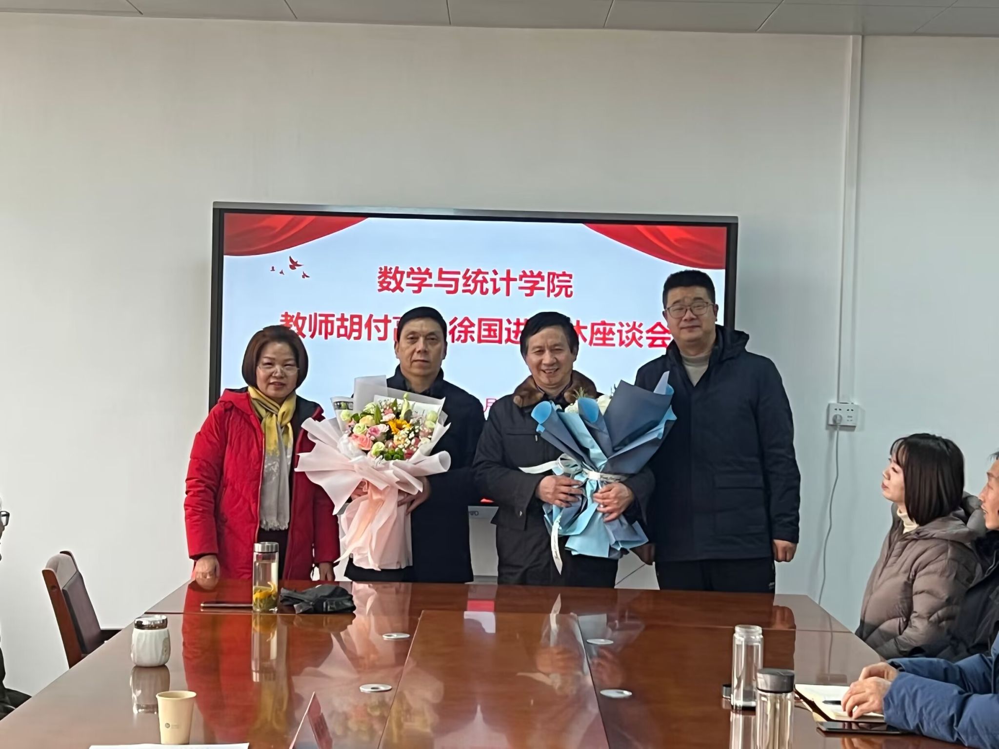 岁月染芳华 桃李育芬芳。为表达对耕耘数载的退休教师的感谢与敬意,进一步激励年轻一代教师传承前辈的育人精神,2024年1月9号下午3点,数统学院在教6三楼会议室举办了胡付高、徐国进两位老师荣休座谈会。数统学院全体领导班子、教师代表参加了会议。座谈会由院党委书记王晶主持。