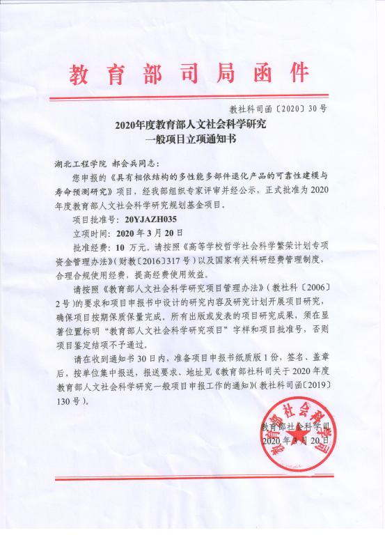 本网讯:近日,教育部发布2020年度人文社会科学研究项目立项通知,我校3个项目喜获立项。其中,我院郝会兵博士主持的《具有相依结构的多性能多部件退化产品的可靠性建模与寿命预测研究》获批规划基金项目,批准经费10万元,这也是郝会兵博士博士第二次获得教育部规划项目。据悉,我院教师近几年来共获得教育部自然科学重点项目、人文社科规划基金项目、青年项目8项。
